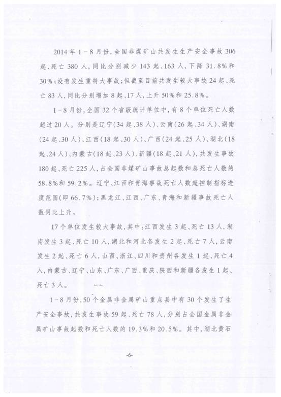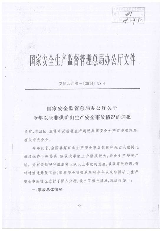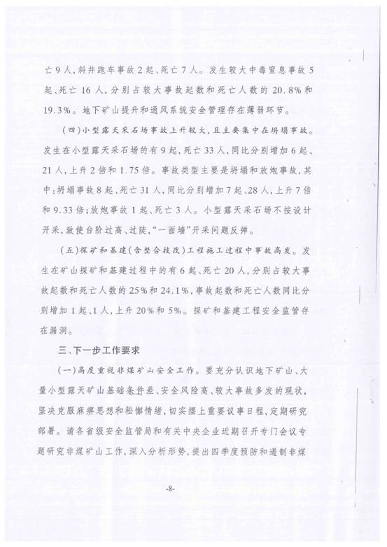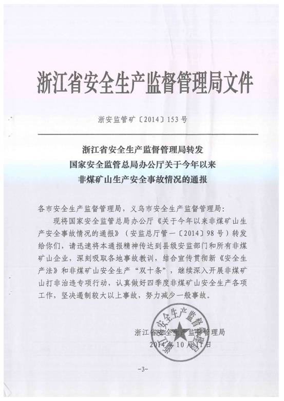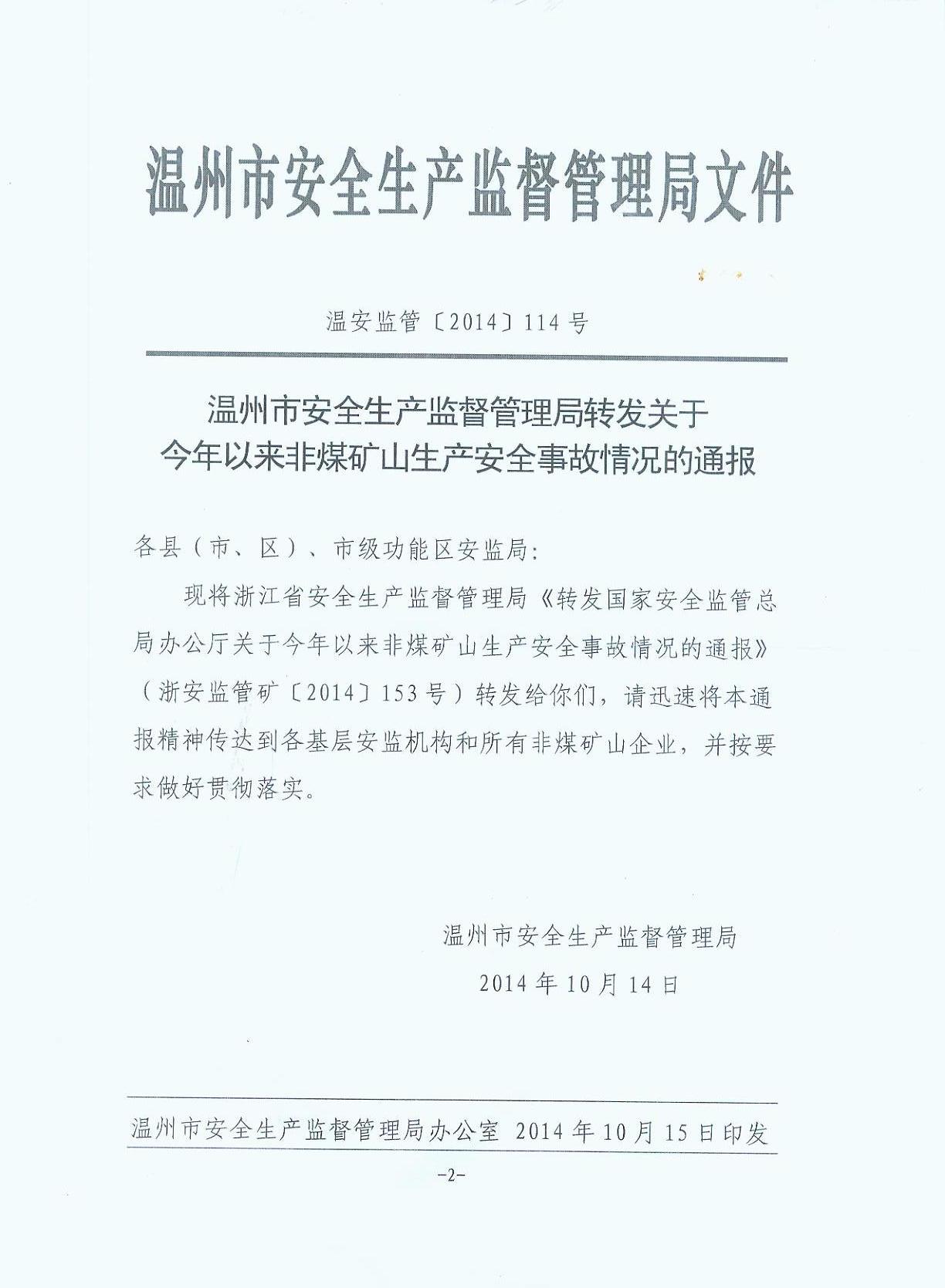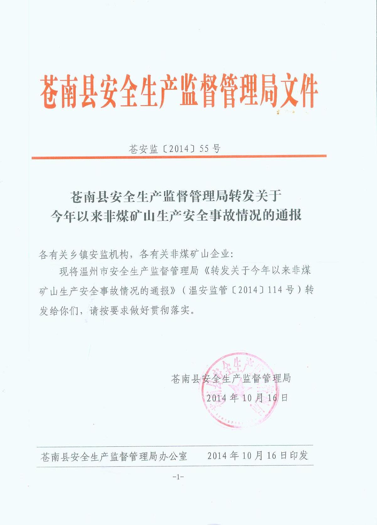 现将苍南县安全生产监督管理局《转发关于今年以来非煤矿山生产安全事故情况的通报》(苍安监[2014]55号)转发给你们,请按要求做好贯彻落实。