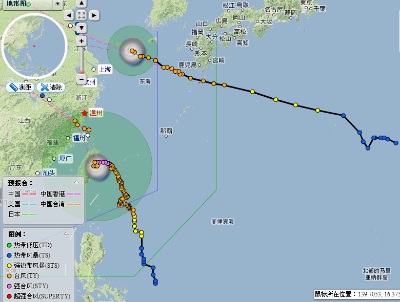 温州市气象台08月02日07时发布的台风警报和天气预报:今年第9号台风“苏拉”,今天3时15分前后在台湾省花莲市登陆,登陆时中心附近最大风力有14级(42米/秒),中心最低气压为950百帕。今天05时中心位于温州东南偏南方向约460公里左右的台湾花莲境内,即北纬23.9度,东经121.5度,近中心最大风力13级(40米/秒),中心最低气压955百帕,七级风圈半径500公里,十级风圈半径120公里。预计未来朝西北方向移动,逐渐向浙闽沿海靠近。最大可能于今天后半夜到明天下午在福建中北部到浙江中部一带沿海登陆。